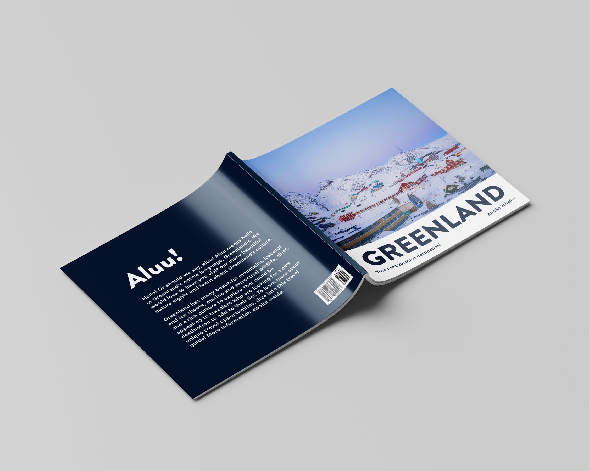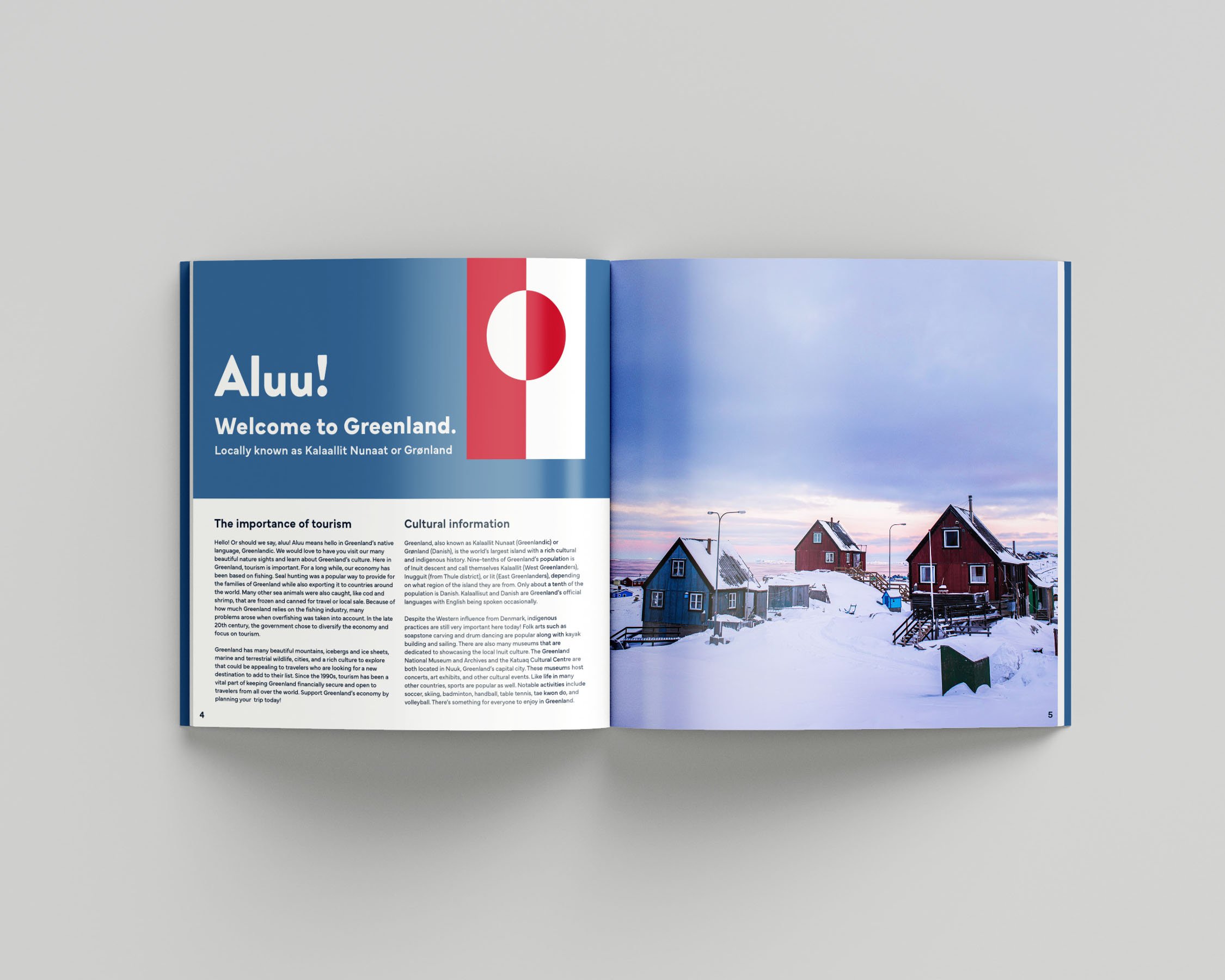 Greenland: Your next vacation destination! is a booklet that informs readers about the unique cultural aspects of the country. It includes an introduction to Greenland’s background as a country, a recipe for the traditional food suaasat, recommendations for hot springs to visit, and an explanation of the festival Mitaarneq. This booklet was created to drive tourism to Greenland as much of their modern economy is built on visiting tourists.