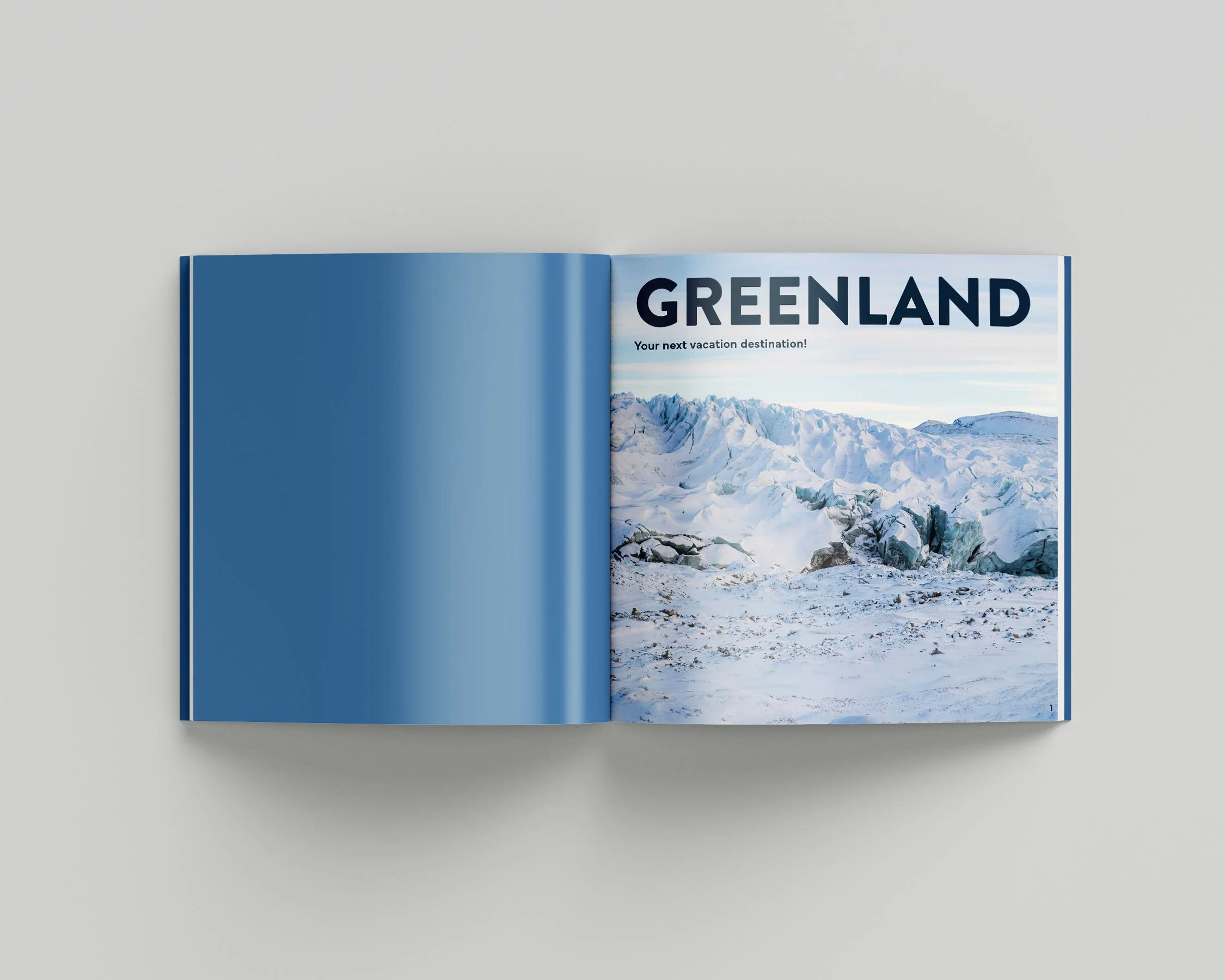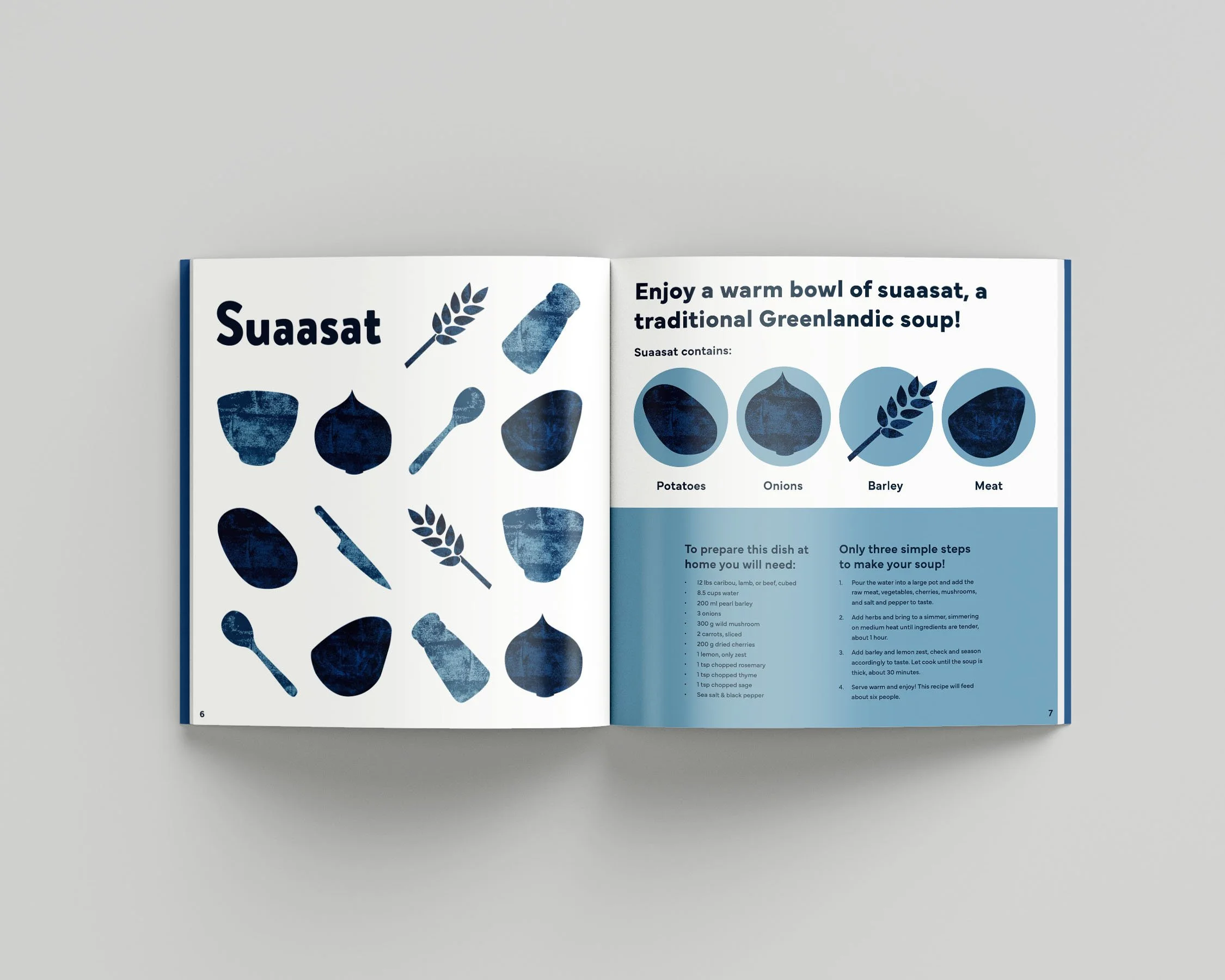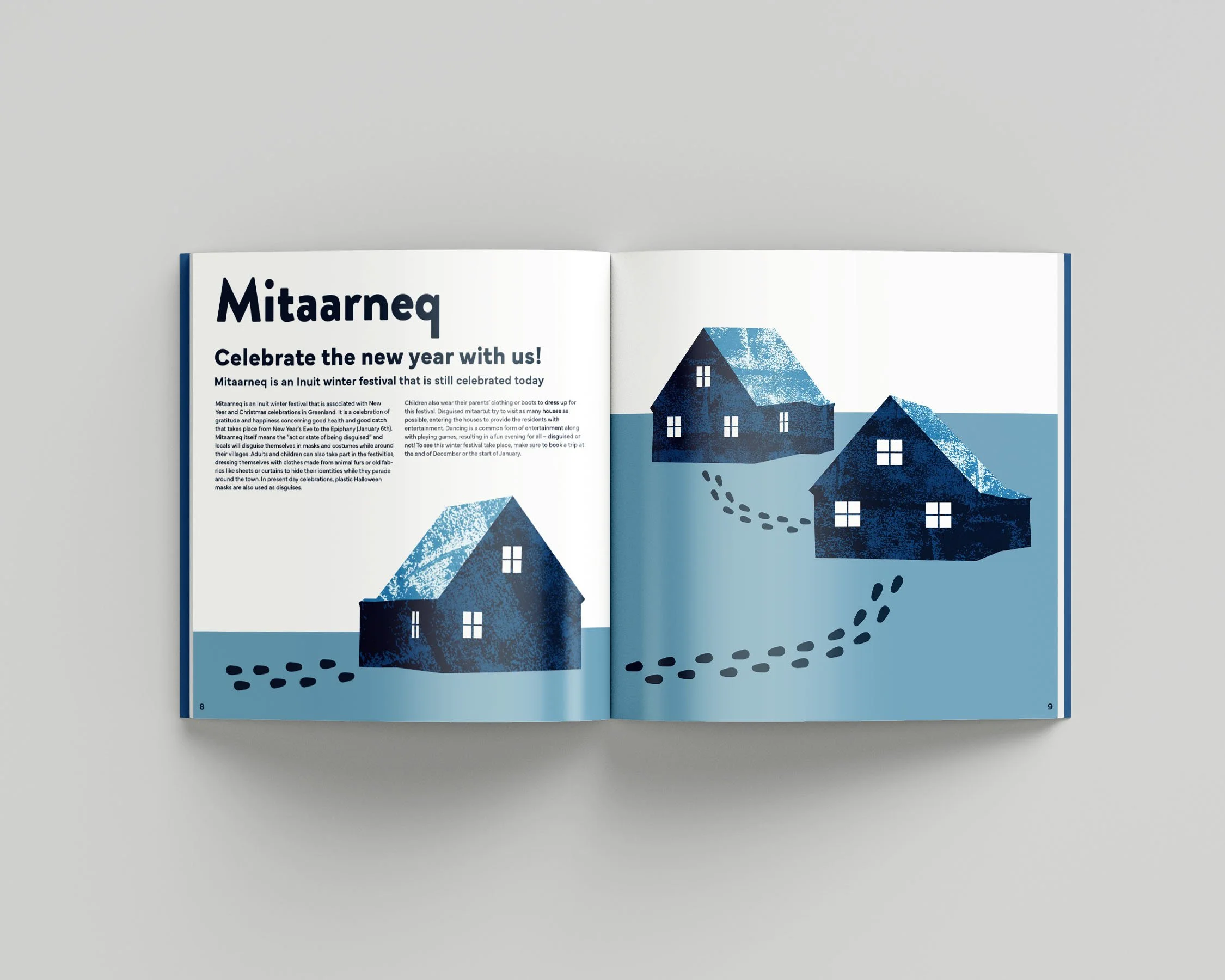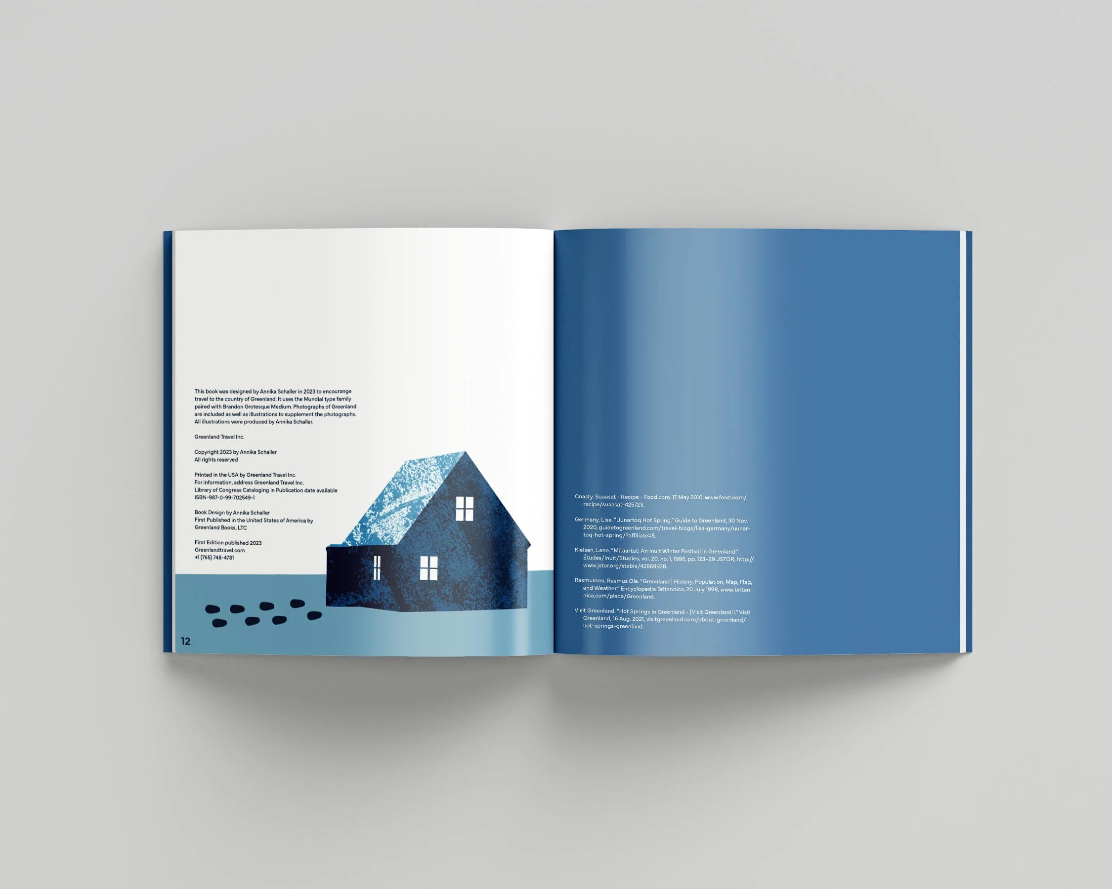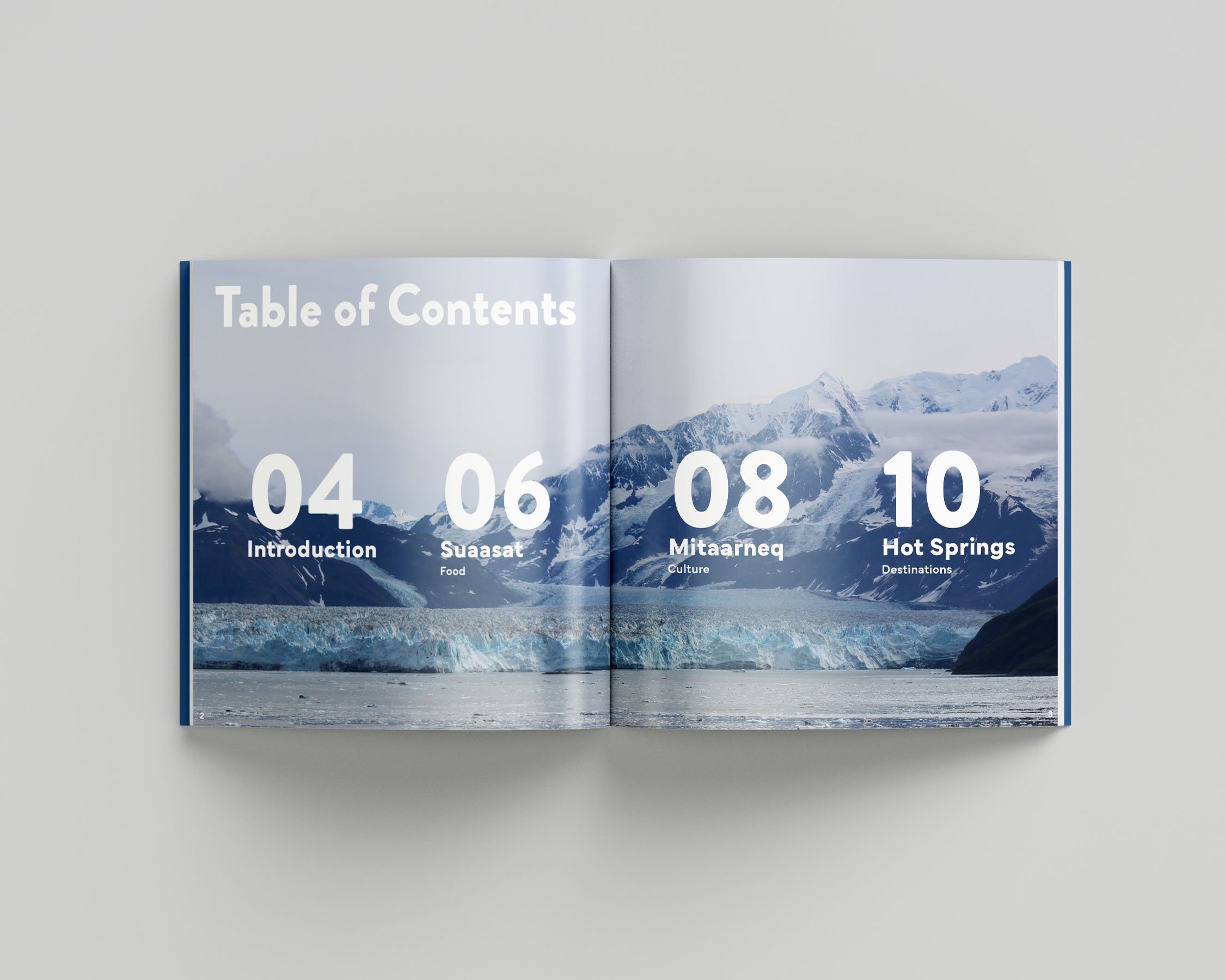 To evoke Greenland’s icy glaciers and deep oceans, shades of blue were utilized in the booklet design. Texture was added to the illustrations on the suaasat and Mitaarneq spreads to call back to the rocky mountains that surround Greenland’s vast oceans. The book was designed to be appealing and spark curiosity to persuade travelers to choose Greenland as their “next vacation destination.”